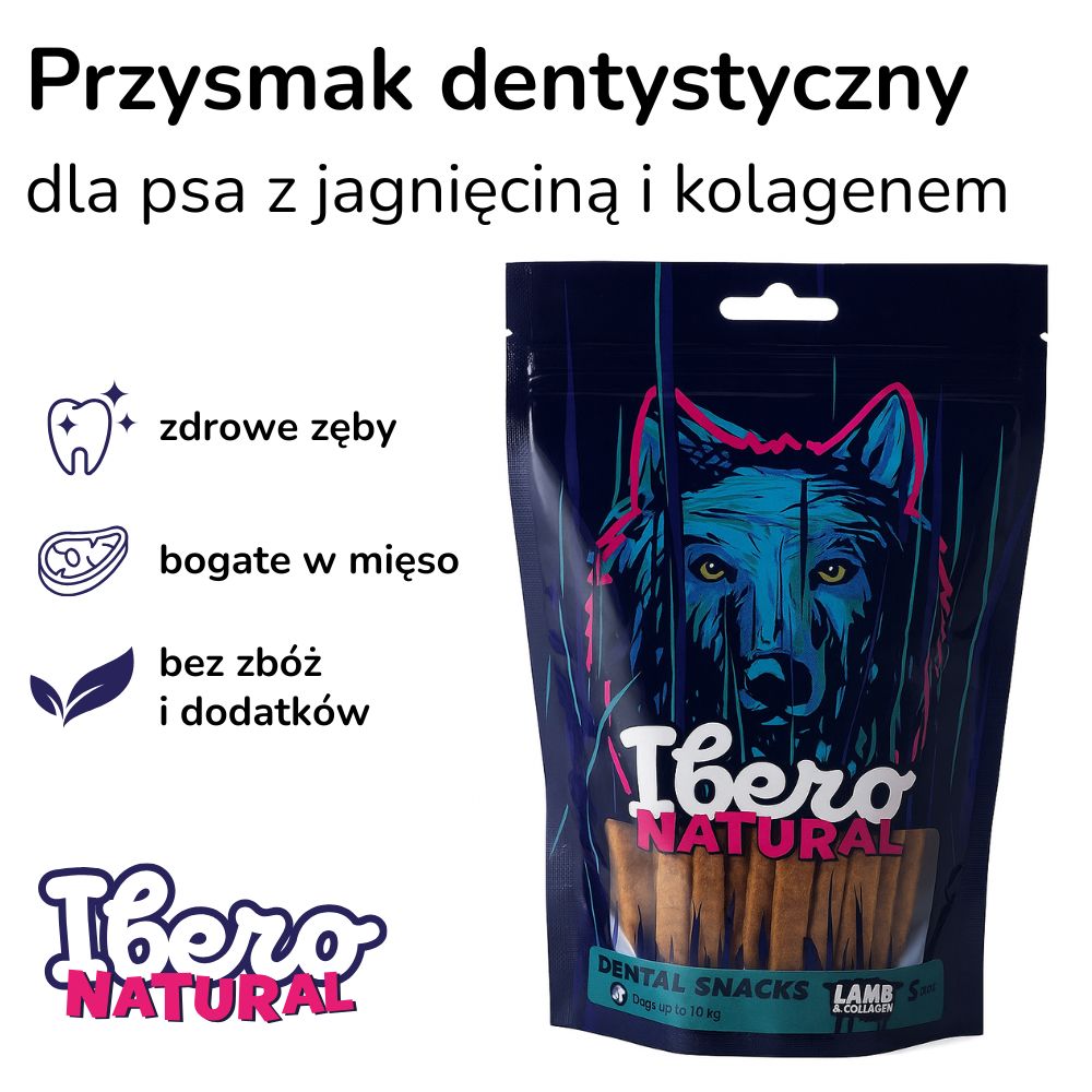 Ibero Natural Dental Snack Jagnięcina & Kolagen – S to półmiękkie, hipoalergiczne przysmaki dentystyczne dla psów małych ras. Zawierają 26% jagnięciny i 11,4% kolagenu, wspierając zdrowie stawów i higienę jamy ustnej. Bez zbóż, sztucznych barwników i aromatów – w wygodnym, zamykanym opakowaniu.